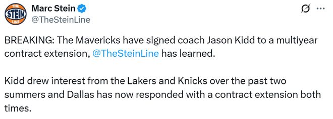 北京时间10月15日,据名记Stein报道,现年52岁的基德与达拉斯独行侠队签下一份多年期续约合同。过去两个休赛期,基德曾收到洛杉矶湖人队和纽约尼克斯队的邀约。此前尼克斯队在寻找主教练时对基德表达兴趣,但独行侠队拒绝放人,此后,外界便预计基德最终会与独行侠队完成续约。